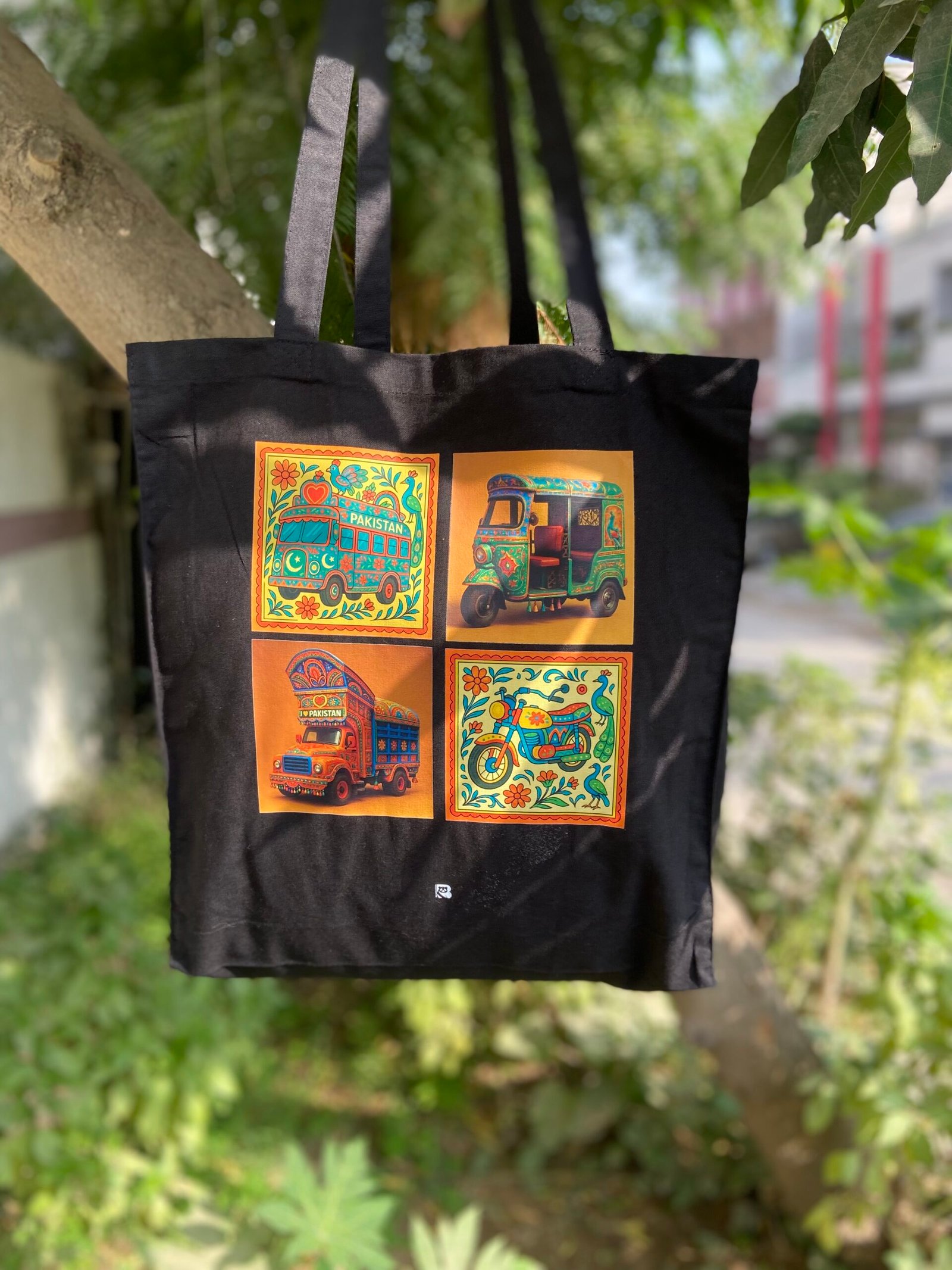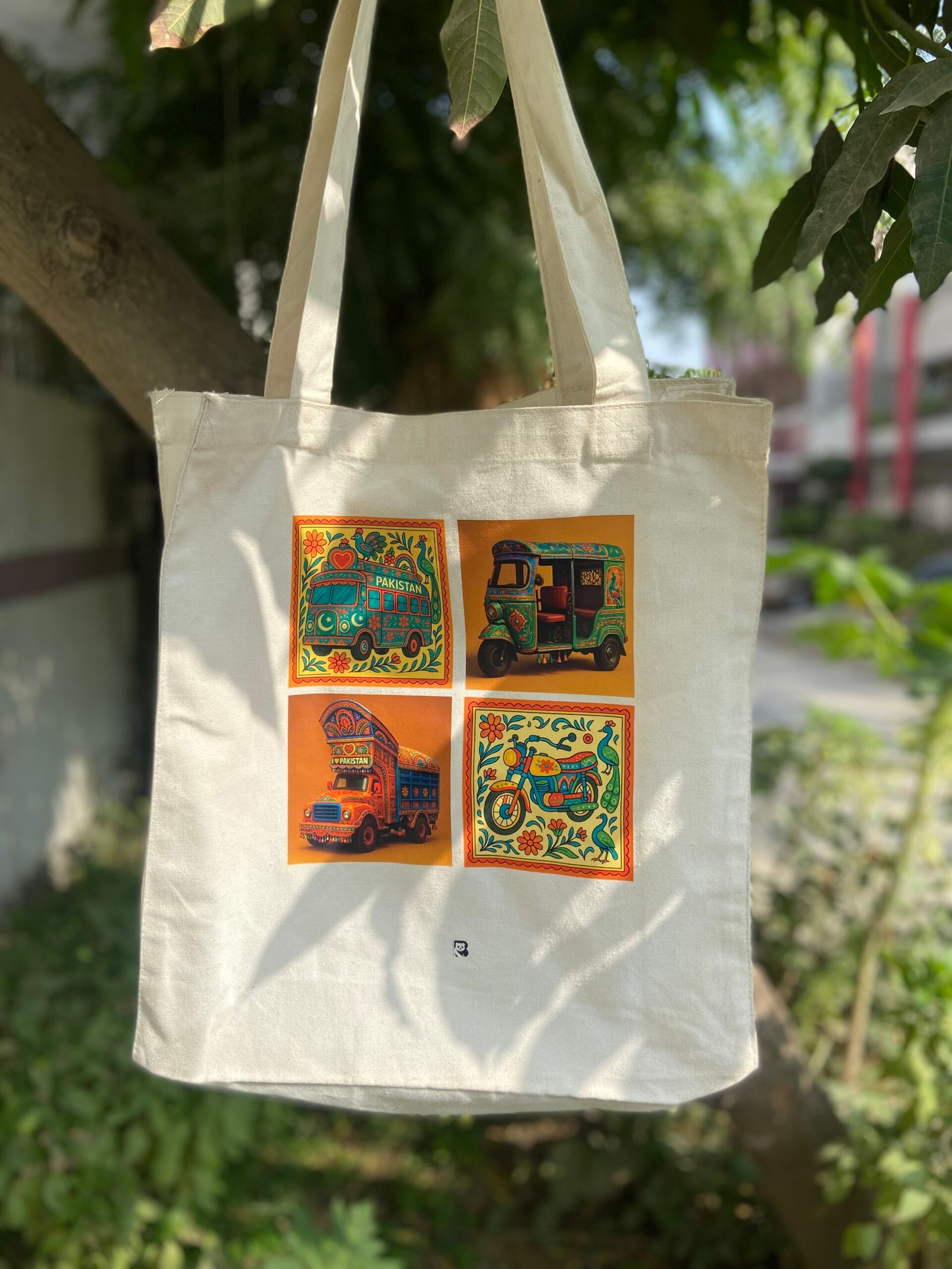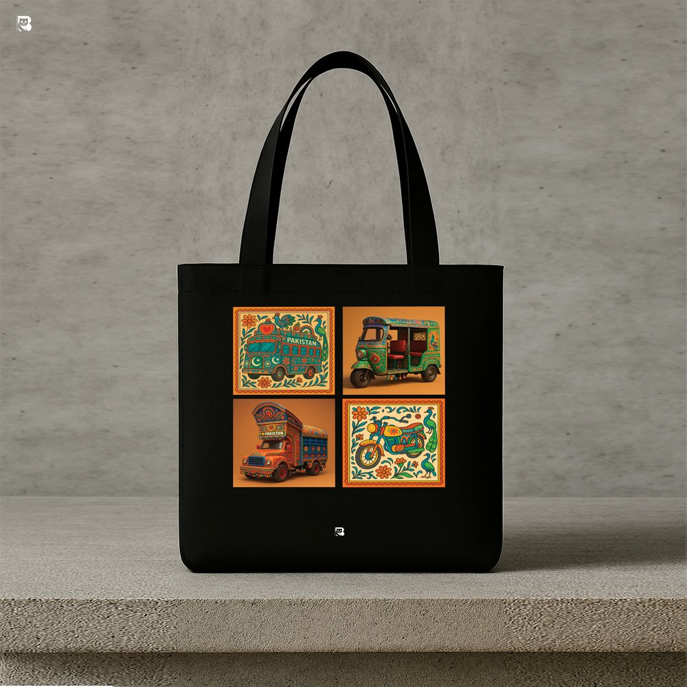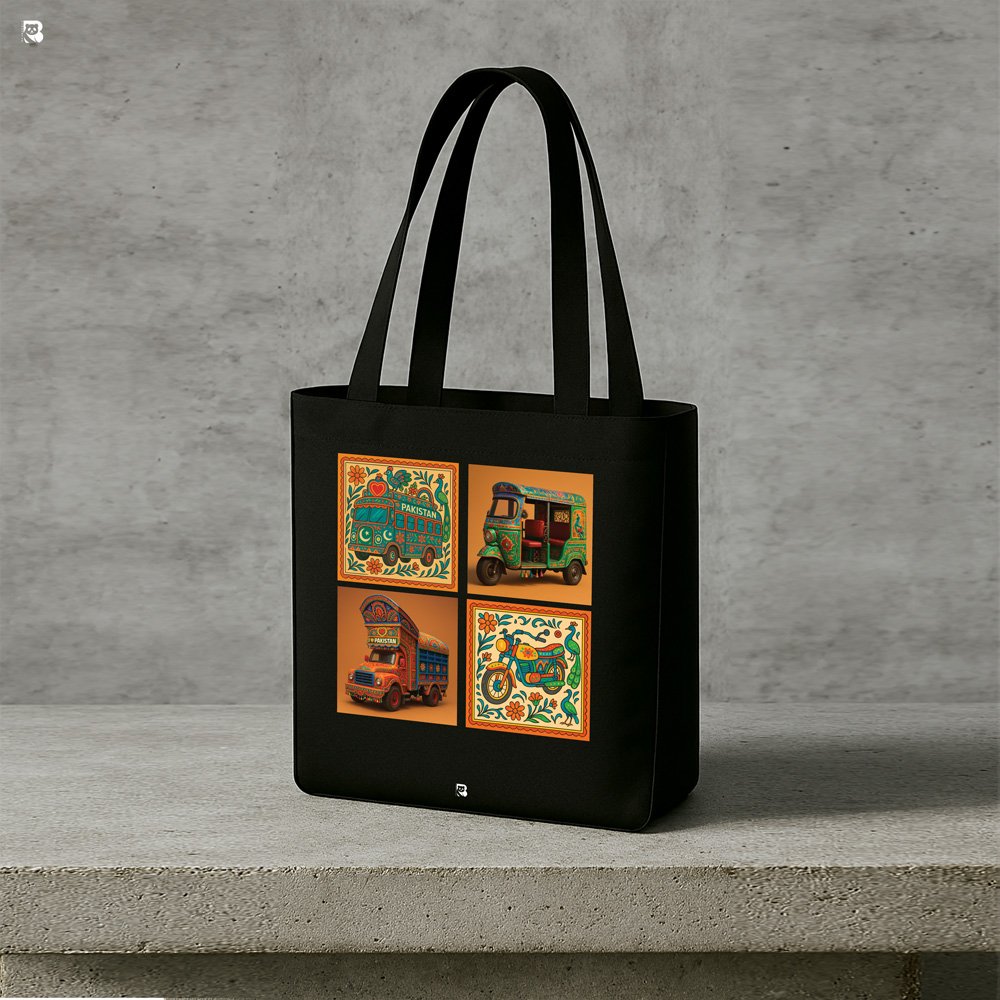 Bring the vibrance of South Asia to your everyday style with this stunning tote bag, featuring traditional Pakistani truck art. Each vehicle — from the rickshaw to the iconic truck — is framed in bold, colorful patterns that celebrate the artistry found on the roads of Pakistan.