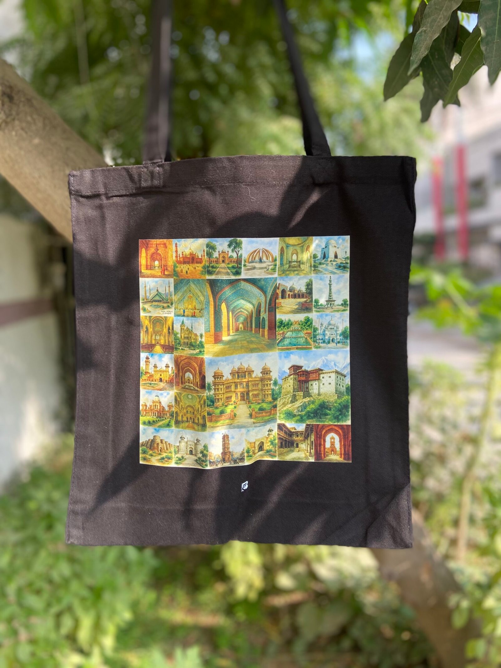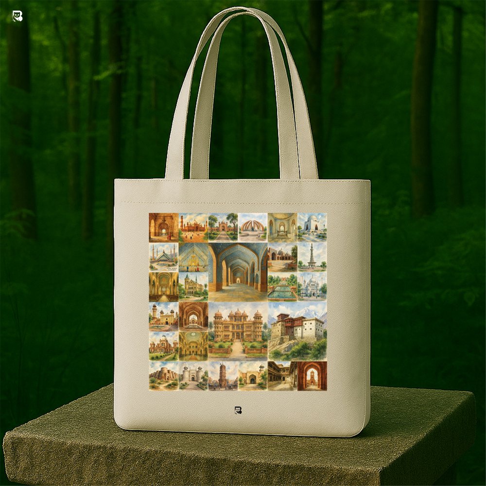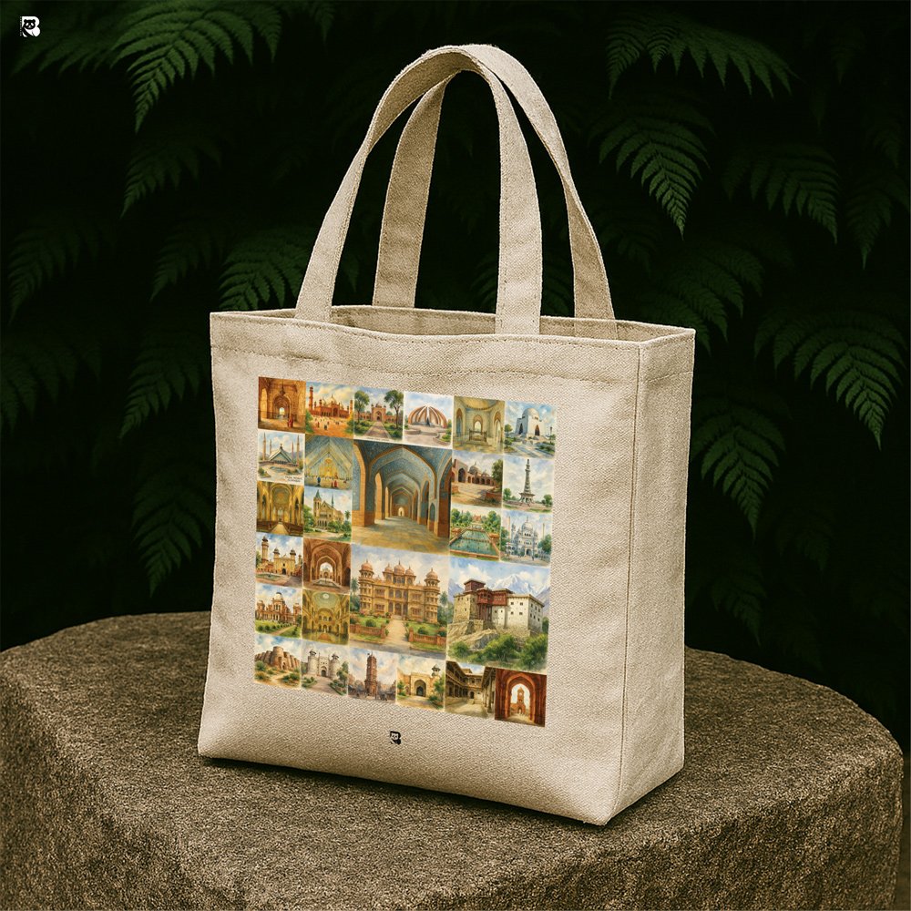 Celebrate the rich tapestry of Pakistan’s architectural legacy with this beautifully designed tote bag. Featuring a vibrant grid of watercolor illustrations, each panel showcases iconic elements from Pakistan’s cultural landmarks—majestic domes, intricate arches, historic palaces, and towering minarets. From Mughal elegance to regional charm, this bag is a tribute to the artistry and history etched into the nation’s skyline.