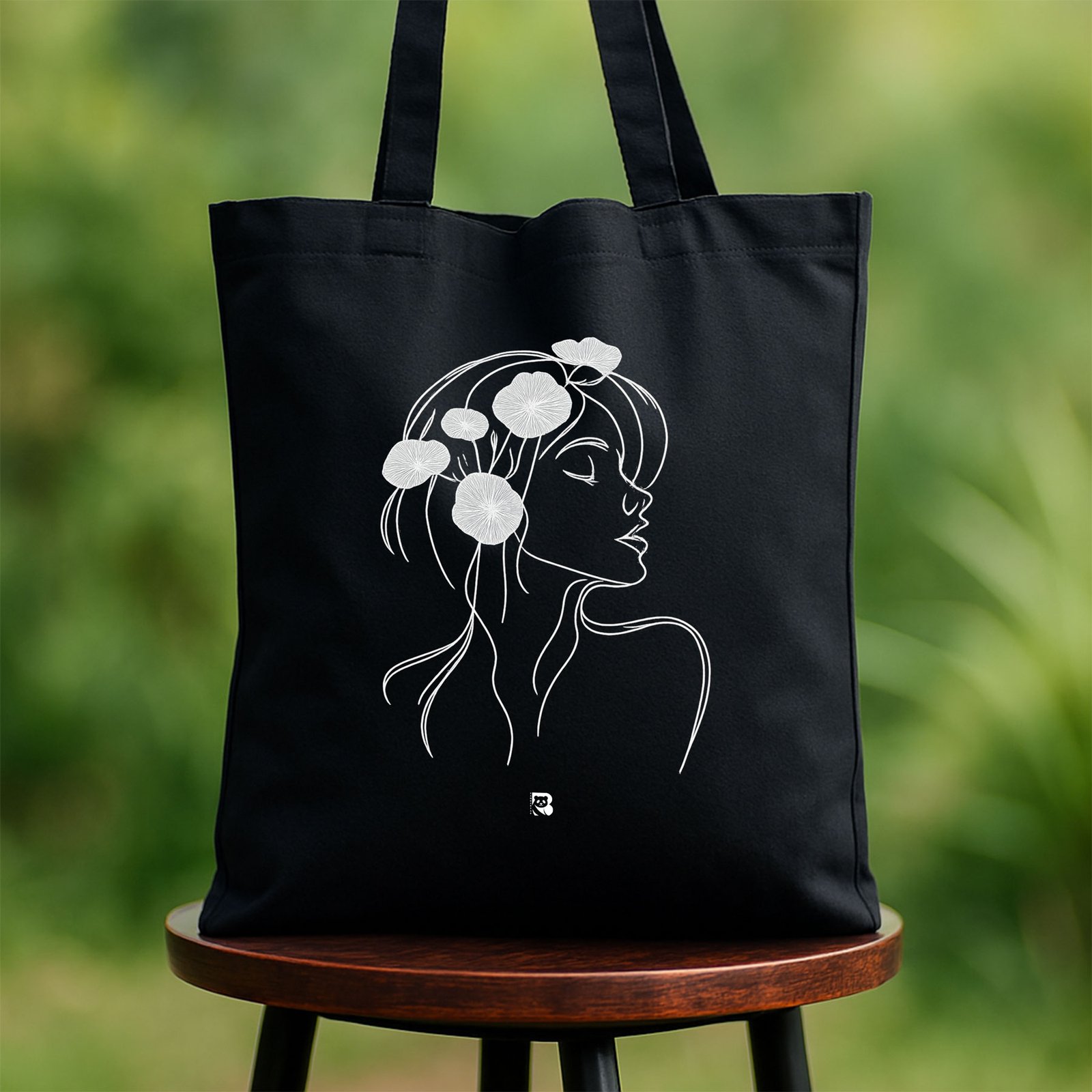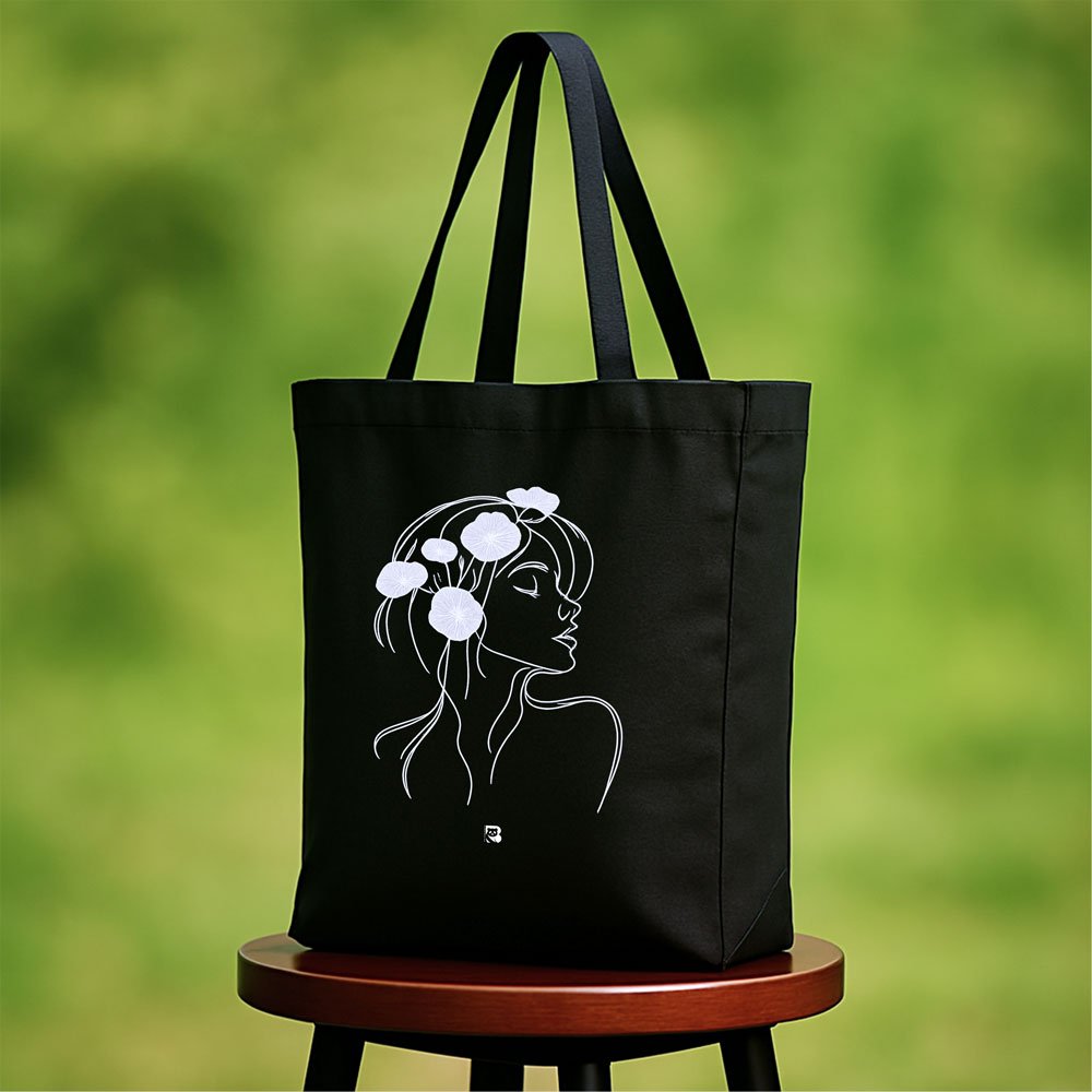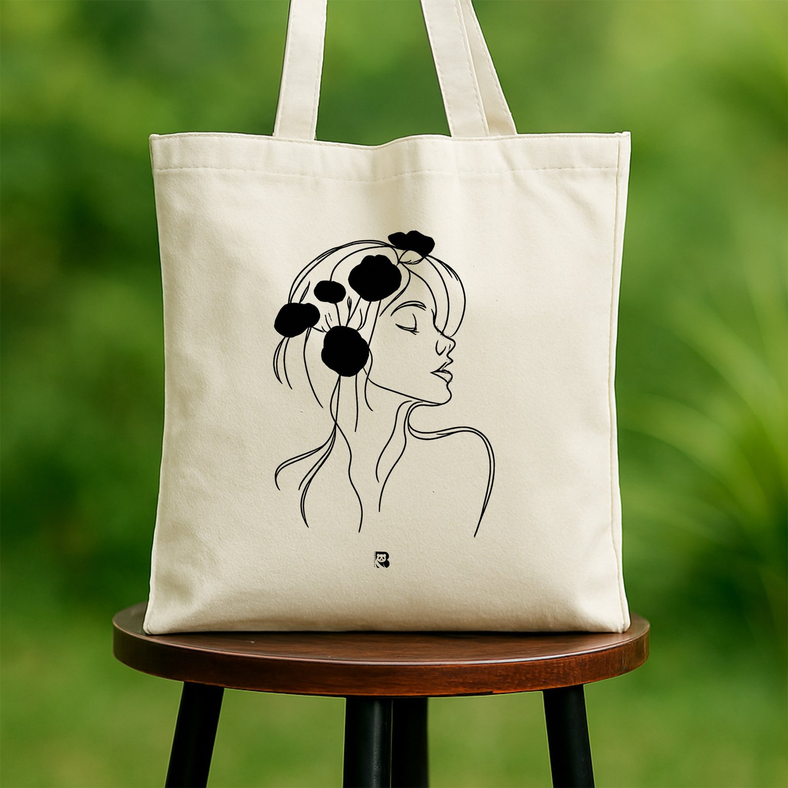 This canvas tote features a minimalist white line illustration of a woman’s profile, her hair adorned with blooming flowers. The design is printed with precision, offering a clean contrast that stands out in any setting. Whether you’re heading to a creative meeting or a quiet walk, this tote adds poetic charm to your look.