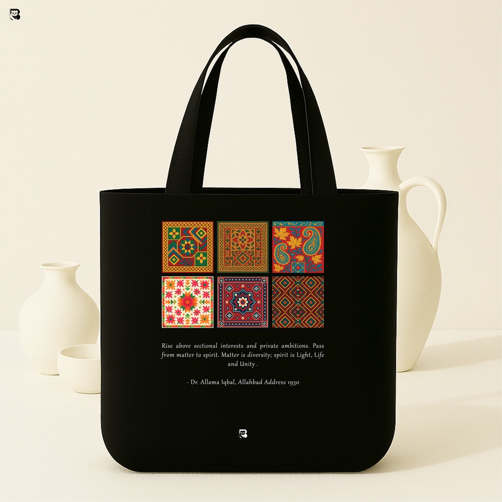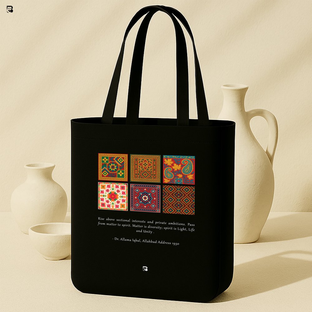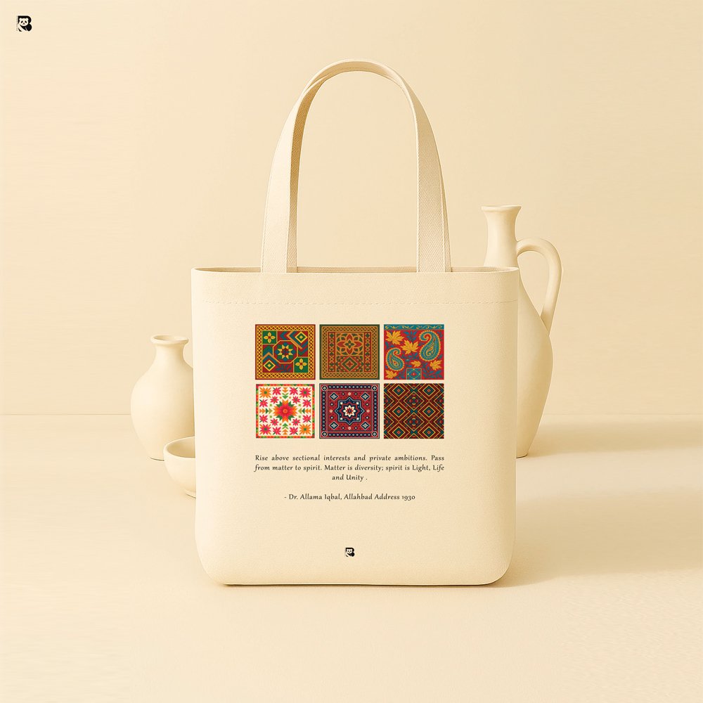 Celebrate the vibrant tapestry of Pakistan with this striking tote bag, featuring six intricately designed square patterns that represent the rich cultural motifs of each province. From the bold hues of Sindh’s ajrak to the geometric elegance of Balochistan, every square is a tribute to the artistry and traditions that define the nation’s soul.