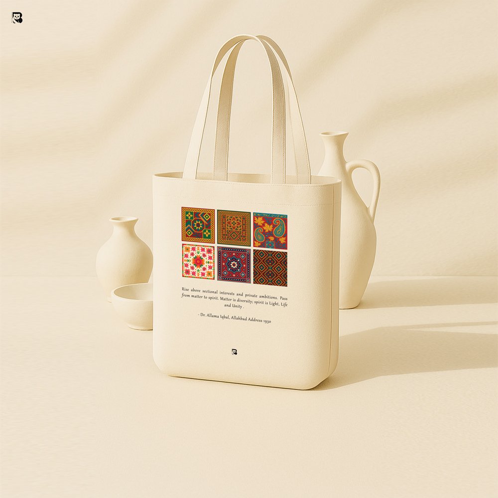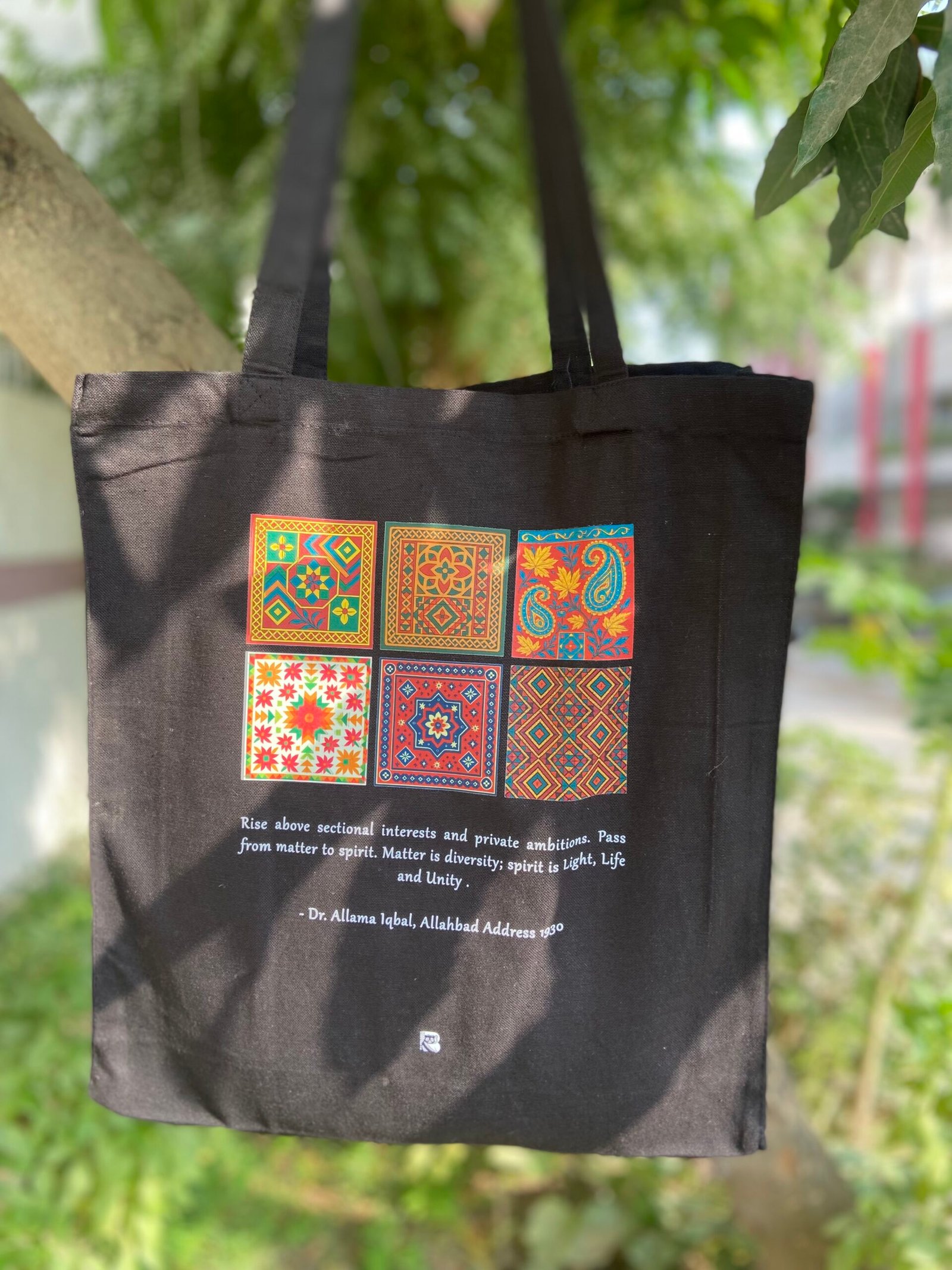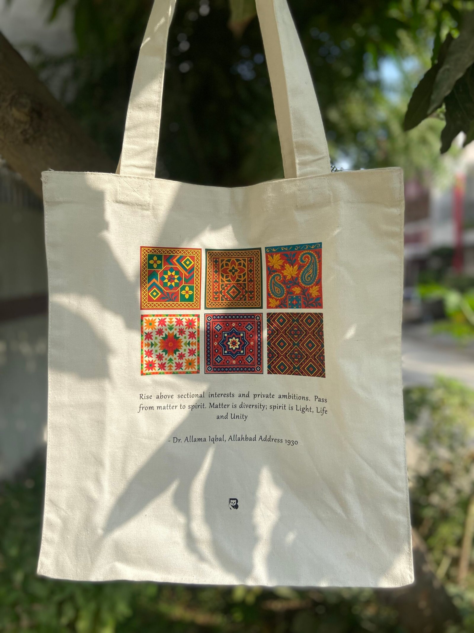 Celebrate the vibrant tapestry of Pakistan with this striking tote bag, featuring six intricately designed square patterns that represent the rich cultural motifs of each province. From the bold hues of Sindh’s ajrak to the geometric elegance of Balochistan, every square is a tribute to the artistry and traditions that define the nation’s soul.
