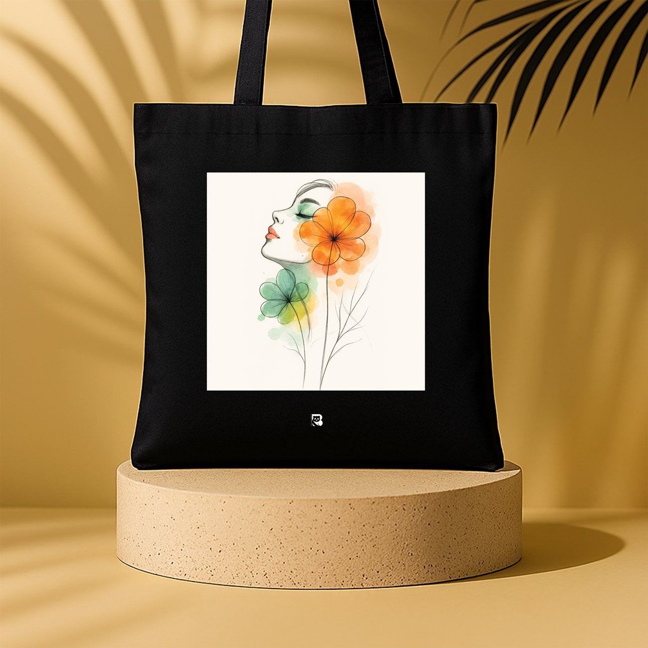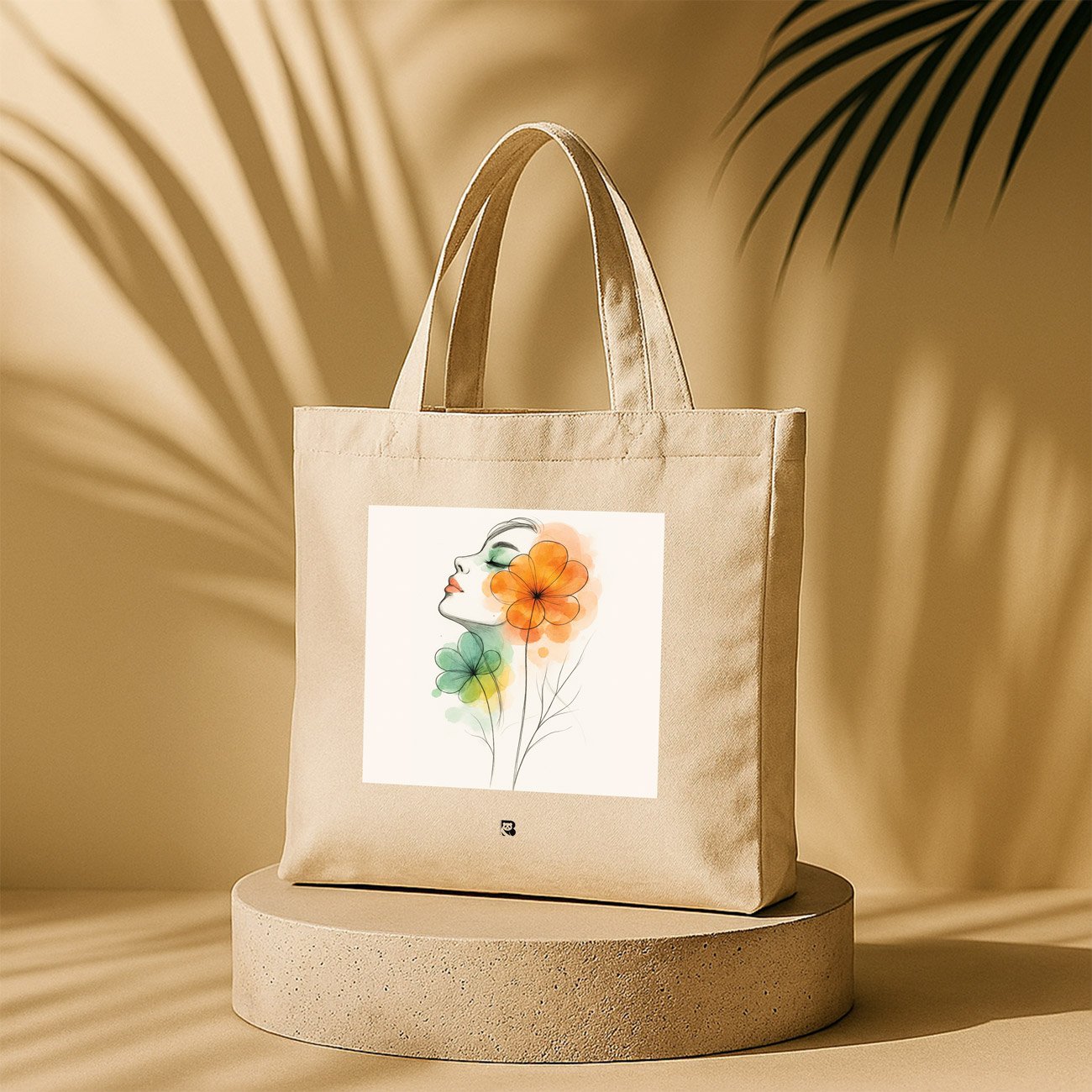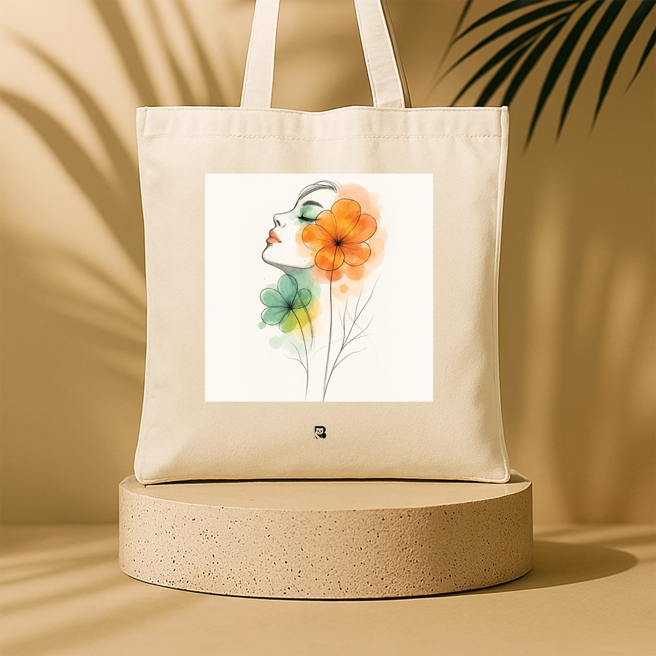 Dreamroot is a soft meditation on growth, memory, and feminine depth. The tote features a watercolor profile of a woman with closed eyes, surrounded by abstract florals in vibrant orange, green, and yellow—blurring the line between thought and bloom. Her expression is serene, her presence ethereal, as if rooted in a dream. Crafted from premium beige canvas with a minimalistic finish, this piece invites reflection and radiates quiet strength. A perfect companion for those who carry calm and color in equal measure.
