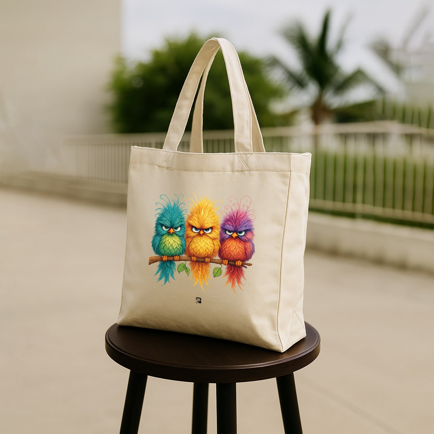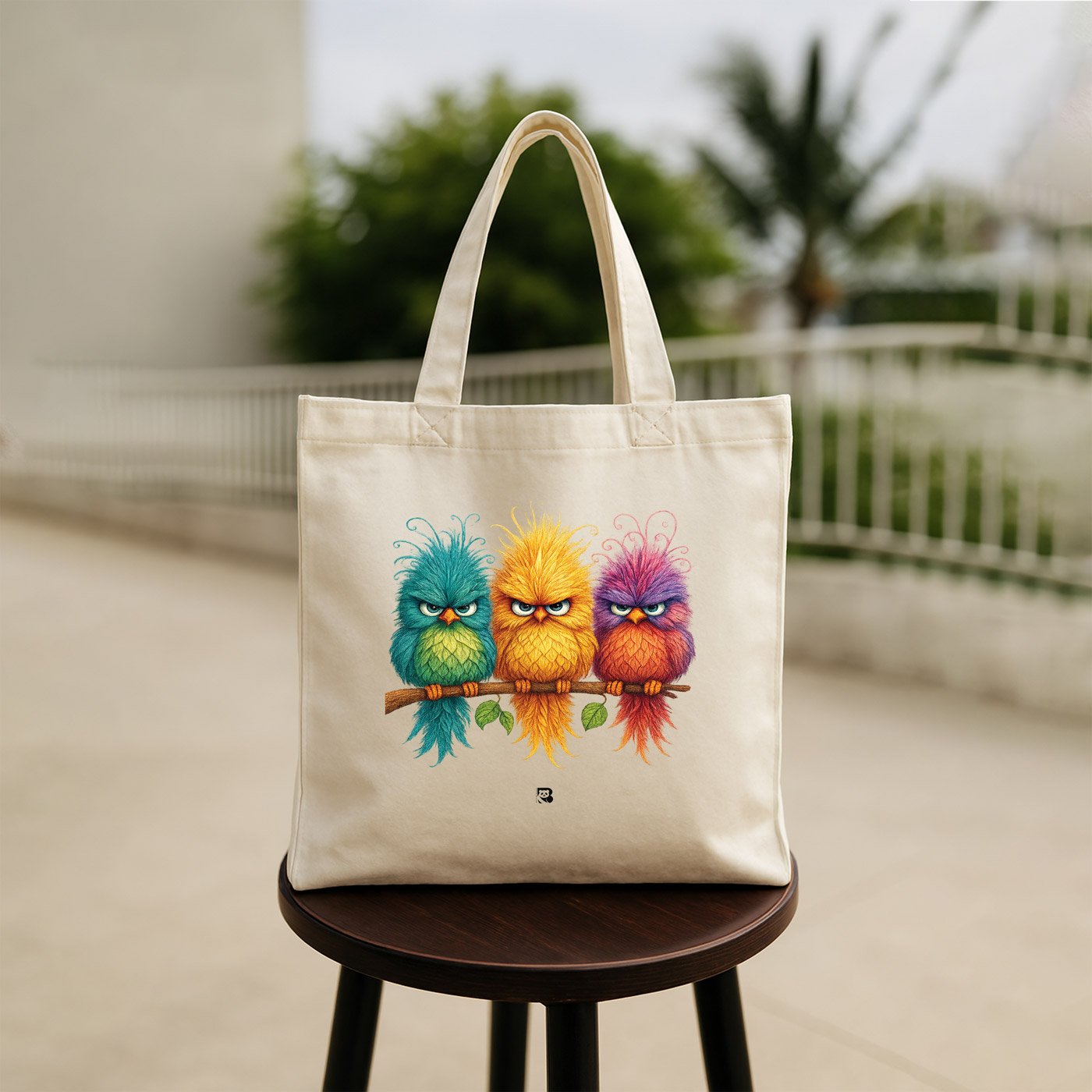 Meet the moodiest branch in the garden. This tote features three delightfully disgruntled birds: turquoise, yellow, and orange with purple tufts. Each perched like they’ve got something to say (but won’t). It’s a celebration of expressive silence, side-eyes, and unapologetic fluff.