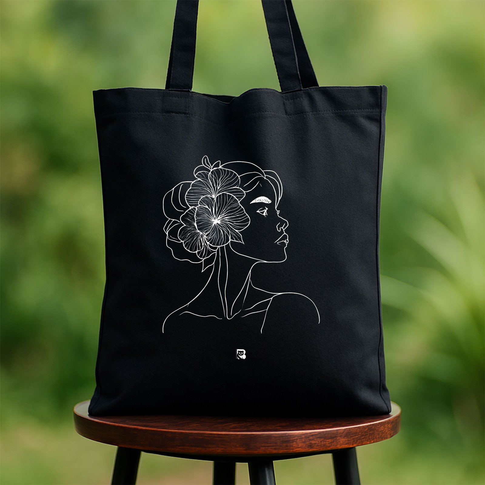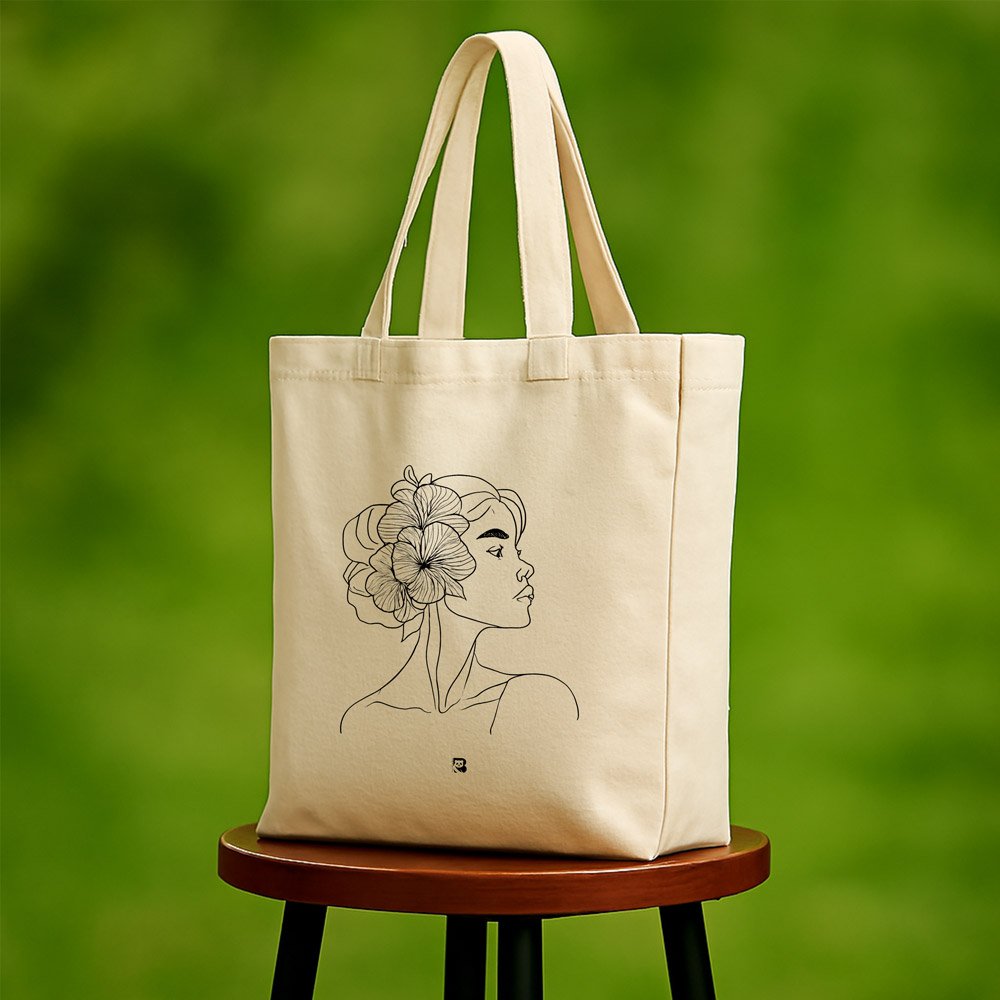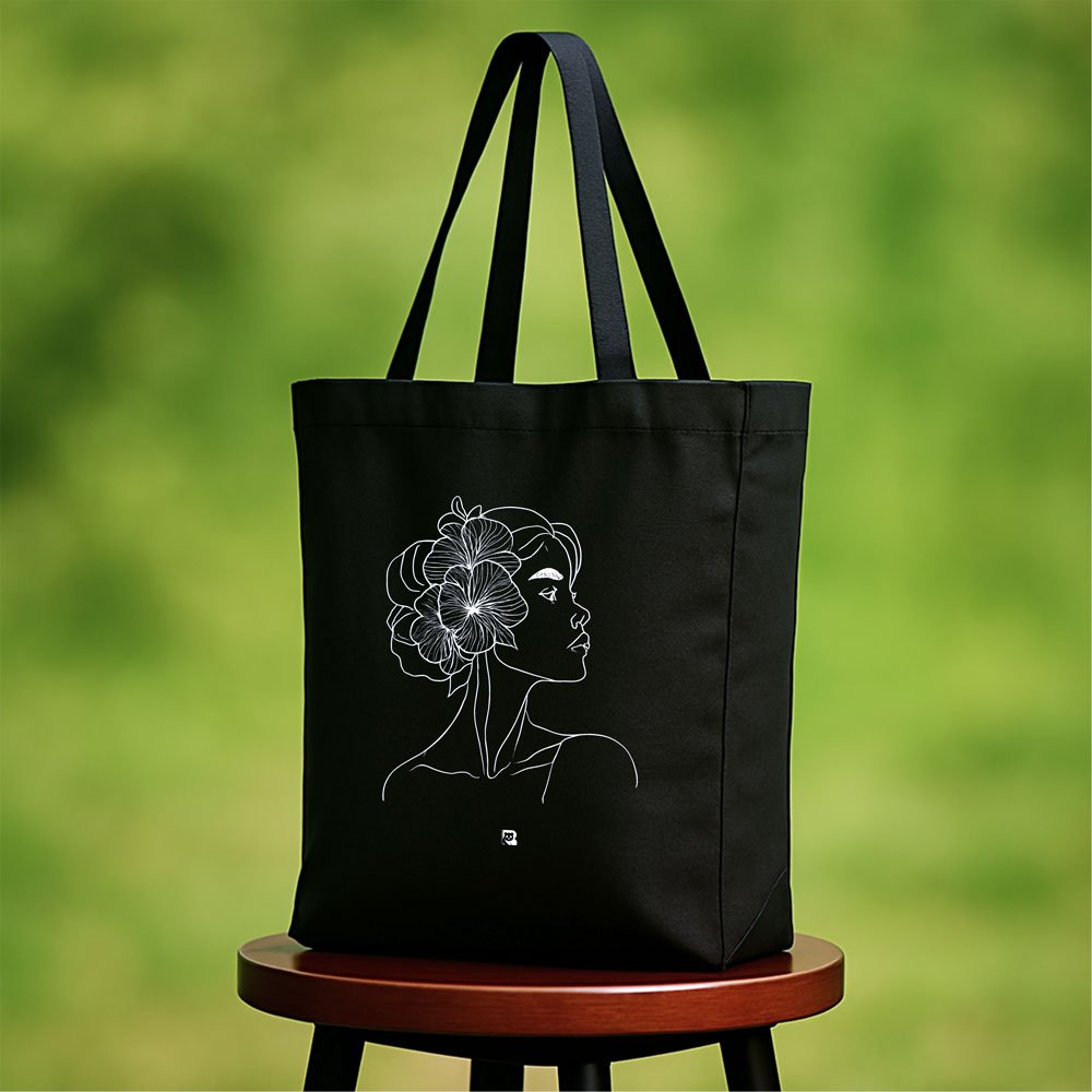 This black canvas tote features a delicate white line art of a woman’s side profile, adorned with a single flower nestled in her hair. The design is simple yet striking, perfect for those who carry poetry in their presence. Whether you’re heading to a café, studio, or bookshop, this tote adds a touch of thoughtful charm to your everyday.