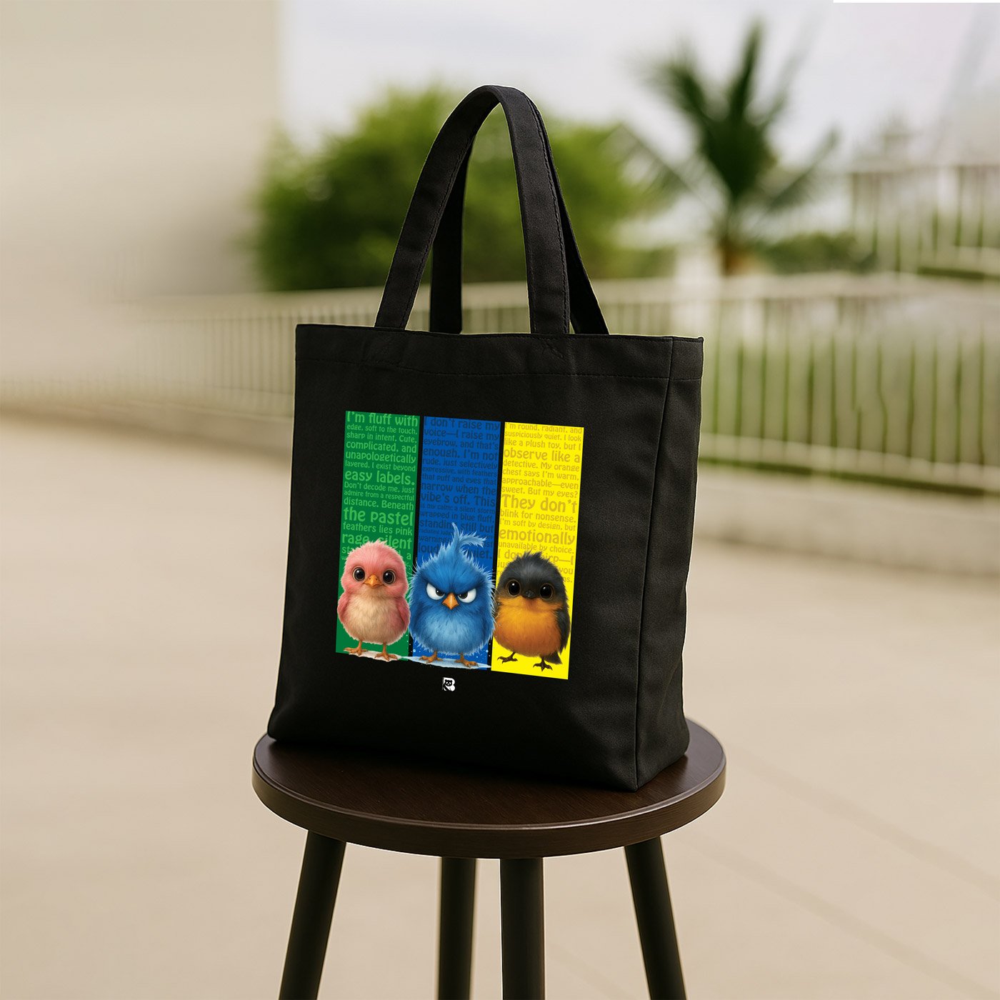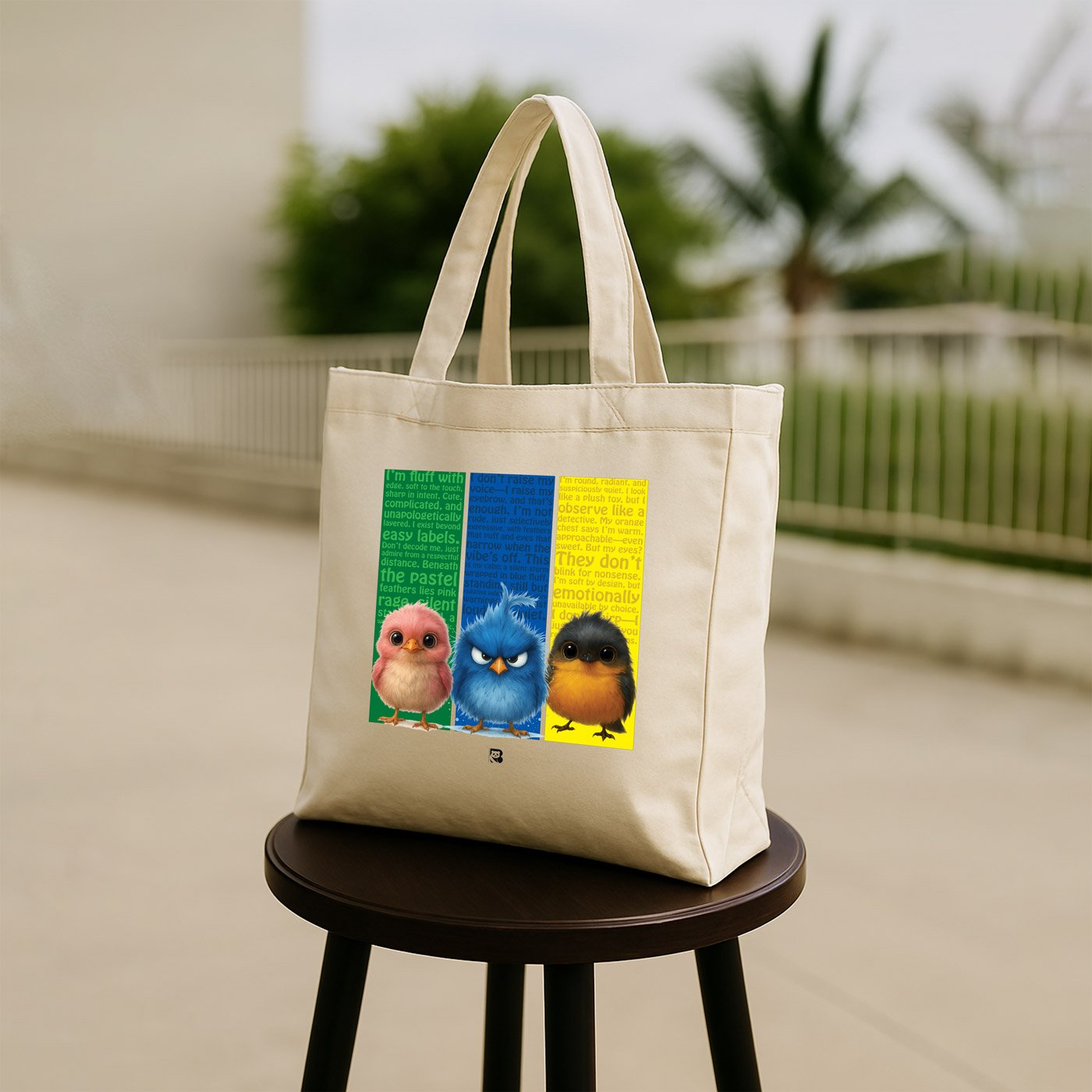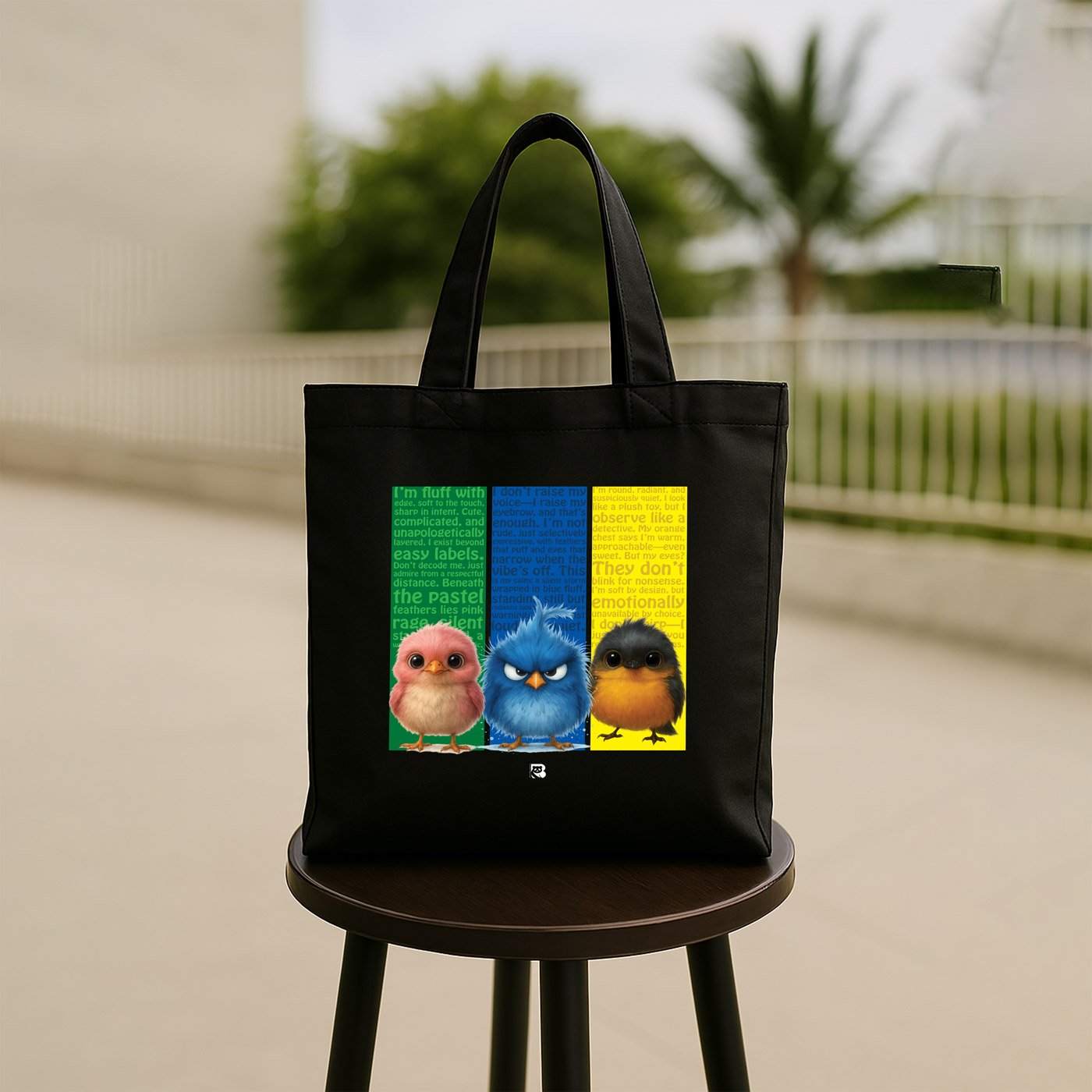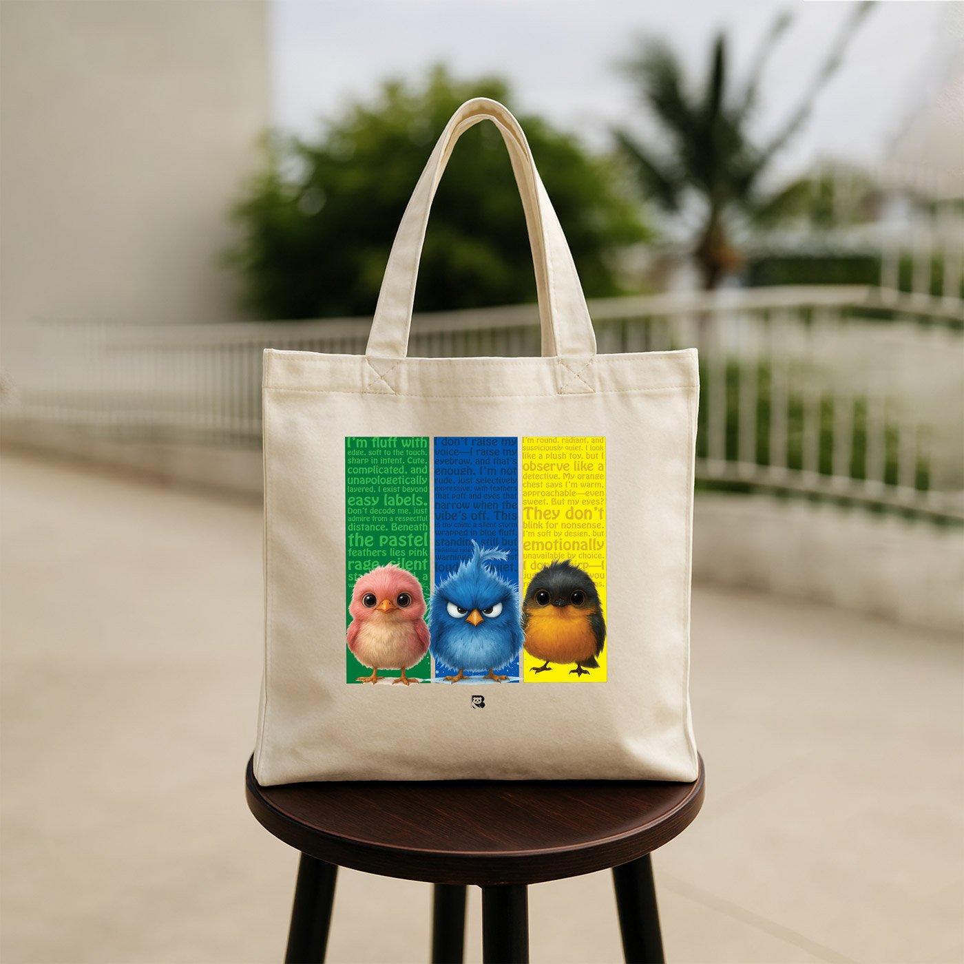 This tote features three cartoon birds, each perched against a bold vertical stripe—pink, blue, and yellow. Their moods range from cheerful to grumpy to emotionally unavailable, with text that challenges stereotypes and embraces complexity. Because sometimes, the softest birds carry the sharpest labels.