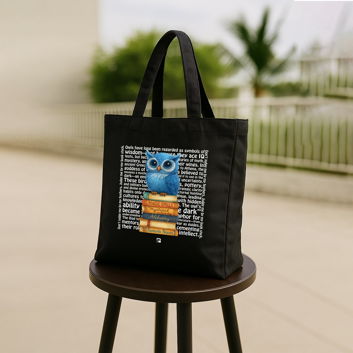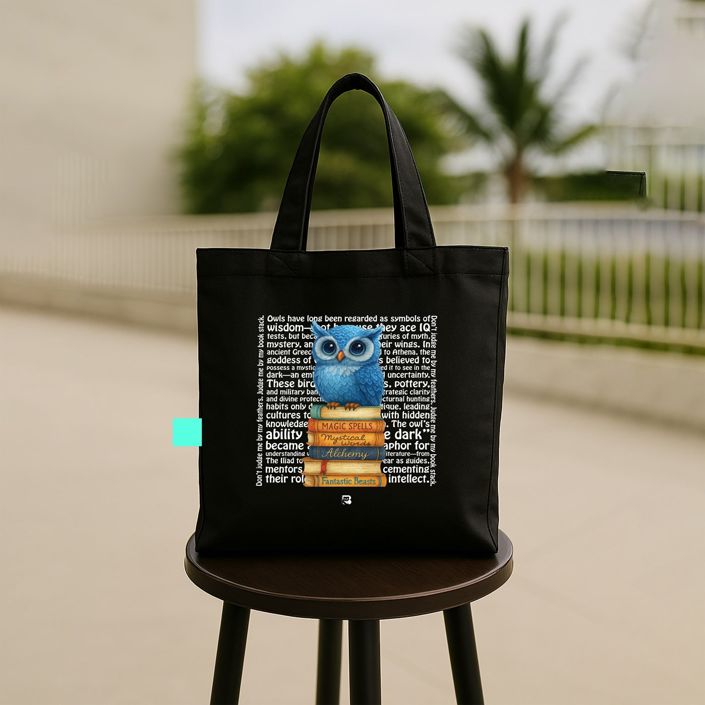 This tote features a wide-eyed blue owl sitting atop a tower of magical books—Magic Spells, Potions, Wisdom, Fairy Tales, and more. Surrounded by lore-rich text, it’s a tribute to the owl’s timeless role as a symbol of intellect, mystery, and quiet power. Whether you’re a late-night thinker or a daylight dreamer, this bag carries your curiosity with style.