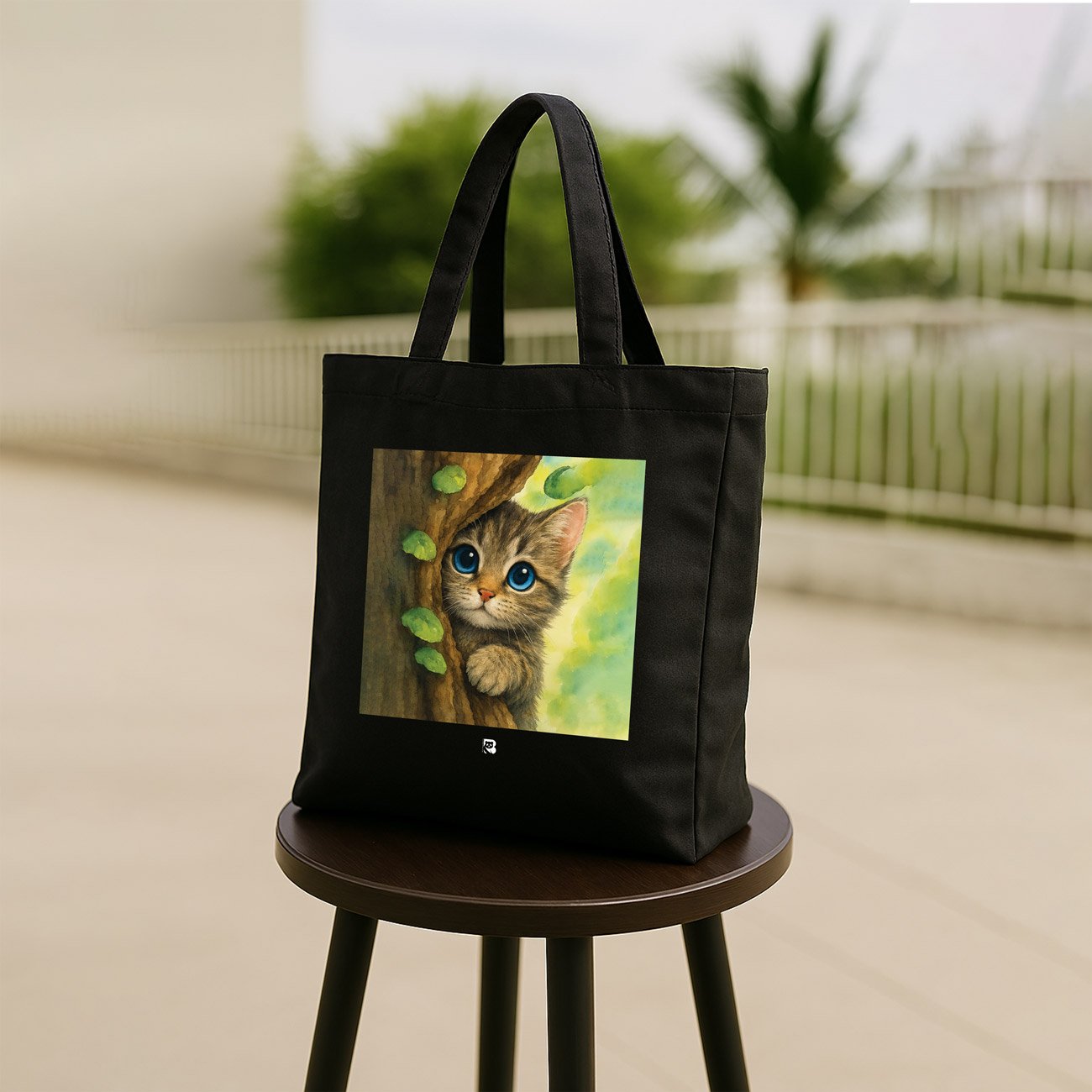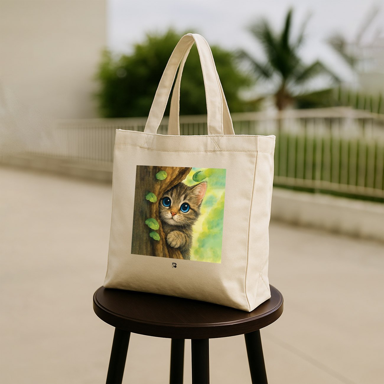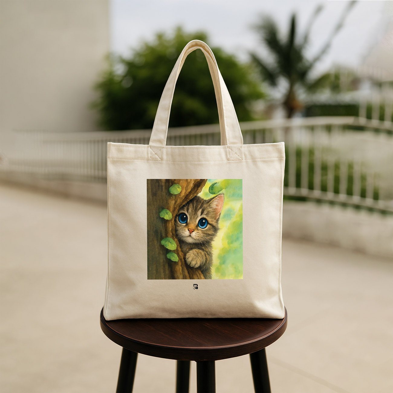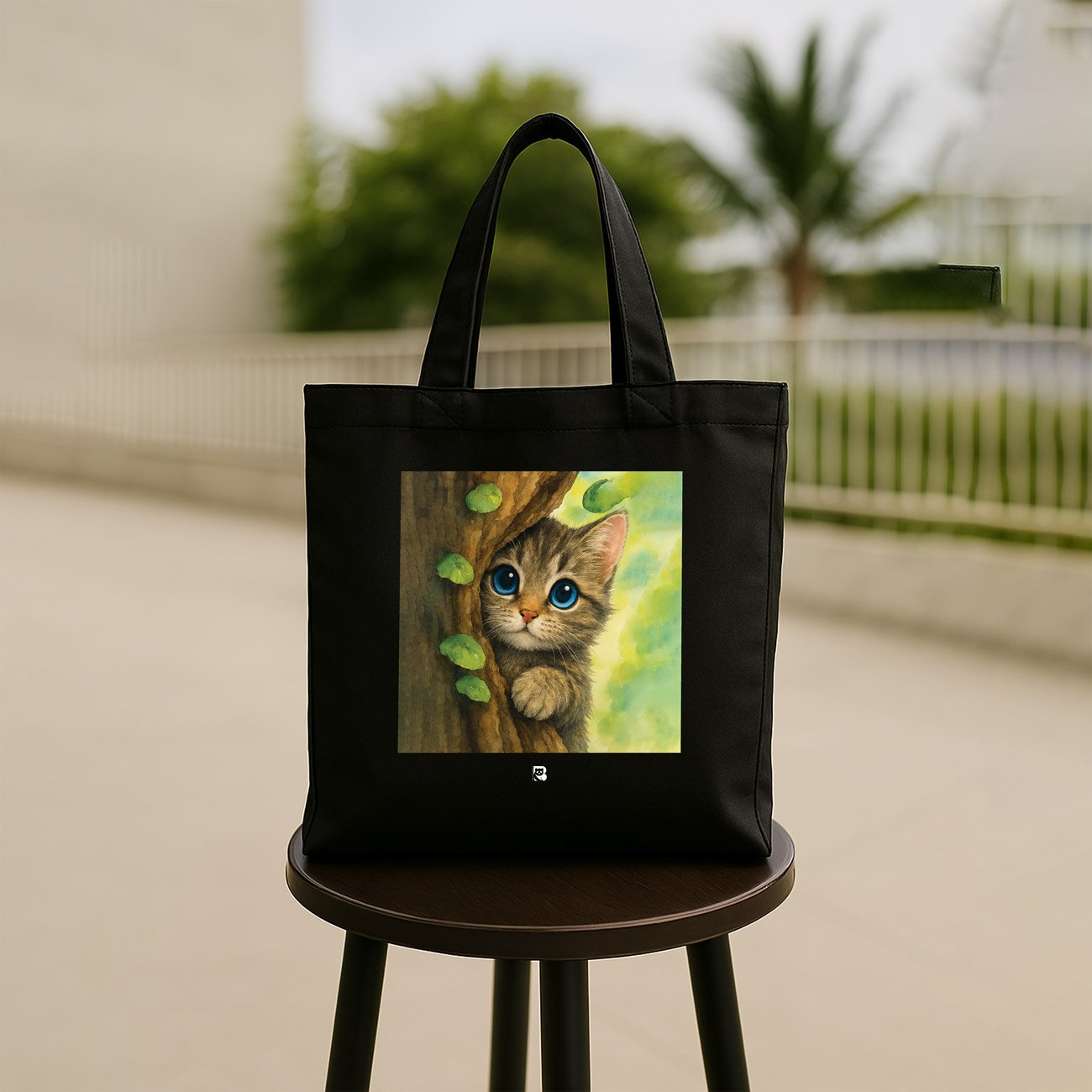 A rustle in the leaves. A flash of fur. A moment caught between hiding and hello. This tote features a wide-eyed, brown-striped kitten peeking from behind a tree trunk, surrounded by soft greenery and golden light. It’s a celebration of feline curiosity and the quiet thrill of being spotted mid-sneak.