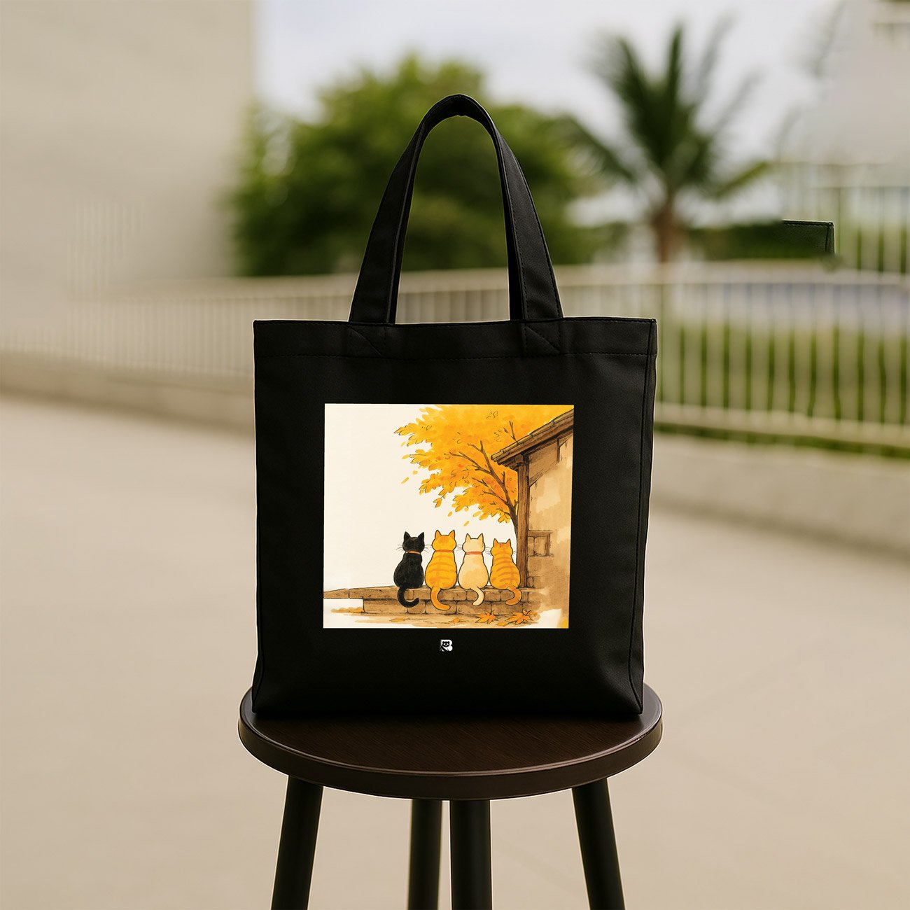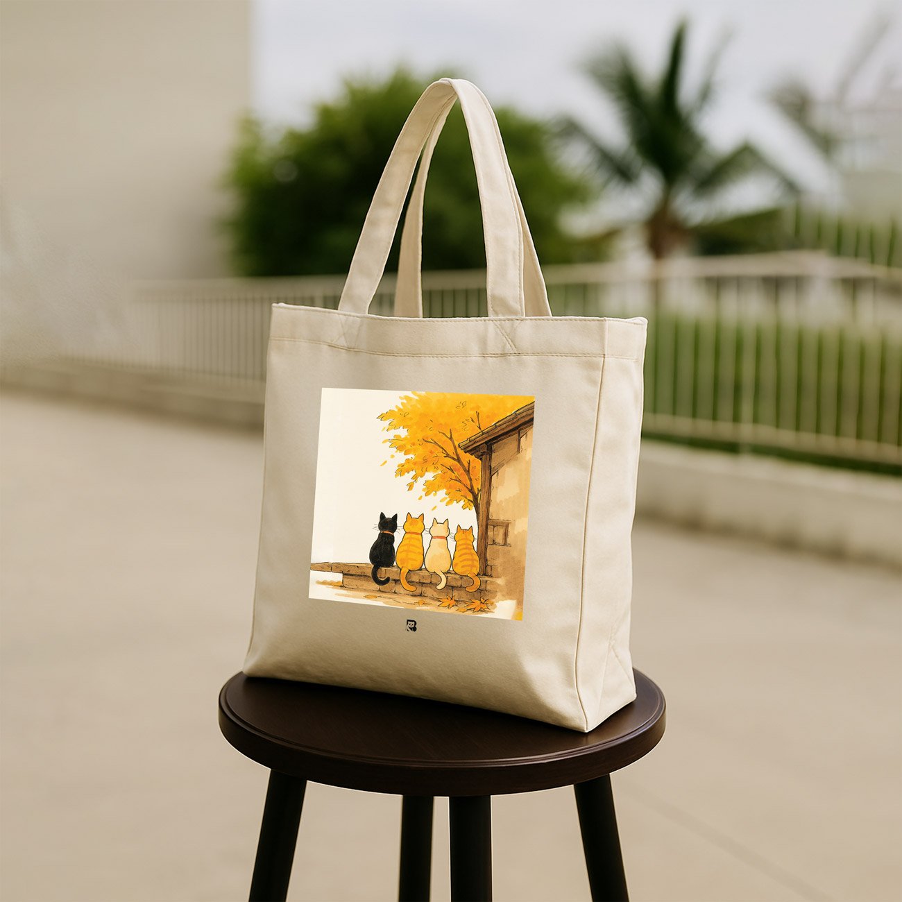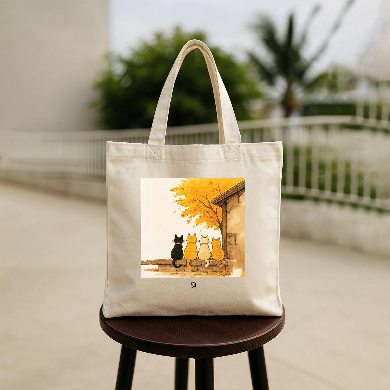 Four cats. One ledge. Infinite stories. This tote captures a fleeting autumn moment where feline friends sit beneath a tree ablaze with yellow-orange leaves. Each cat faces the same direction, as if watching the world change together. It’s a portrait of silent companionship, seasonal magic, and the kind of bond that doesn’t need words.